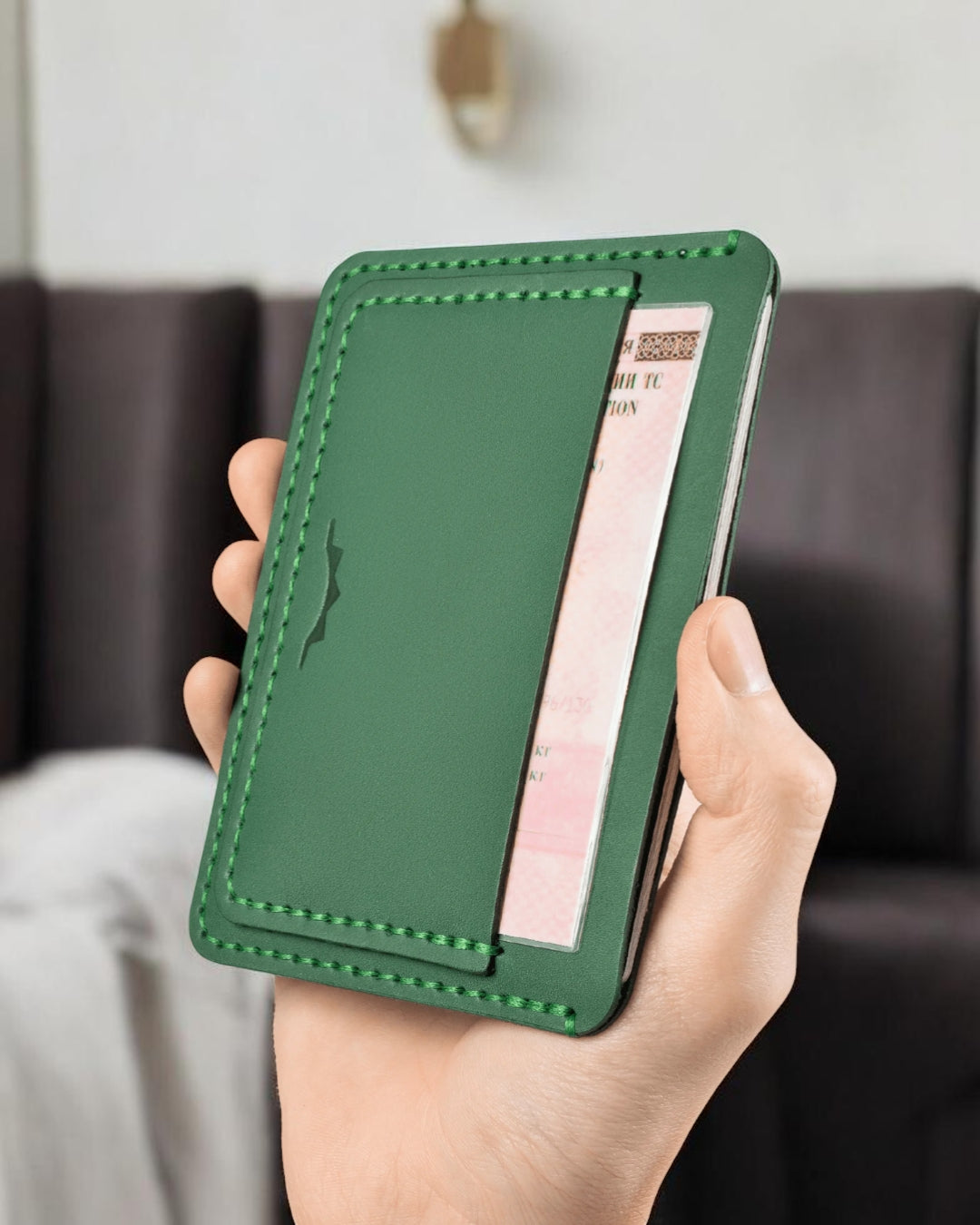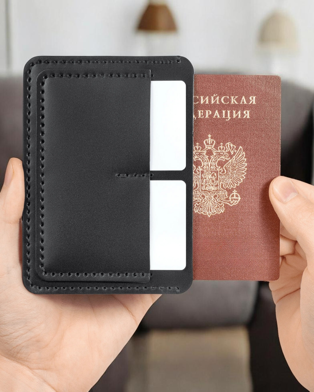 Le portefeuille « Light » est doté de compartiments pour cartes, pour passeport, pour la carte grise (STS) et la carte d’assurance sociale (SNILS). Il peut également contenir des billets ainsi qu’une police d’assurance pliée.